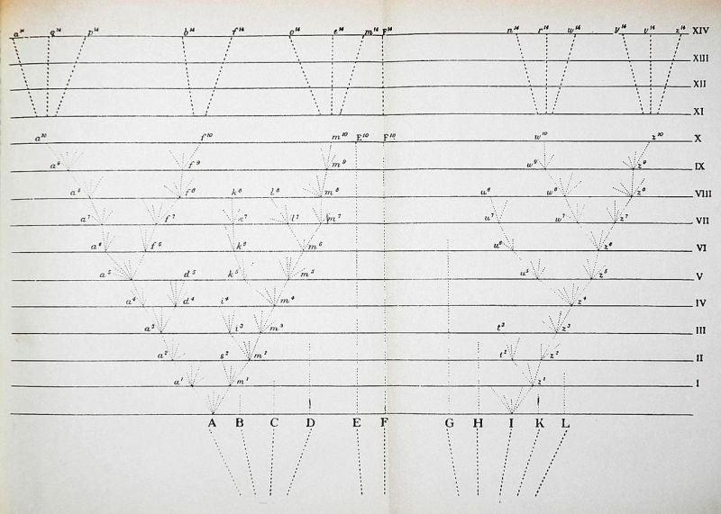 Om gemeenschappelijk afstamming uit te leggen gebruiken we een diagram van Charles Darwin.